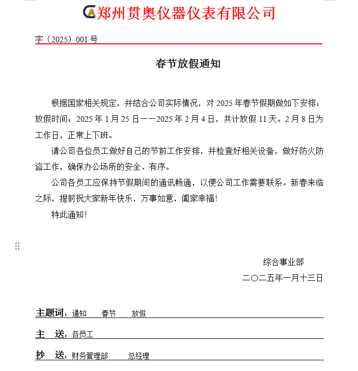 鄭州貫奧儀器儀表有限公司2025年春節放假通知